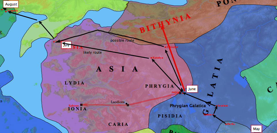 Let me start reading in verse 6 and we will insert dates as we go. Now when they had gone through Phrygia and the region of Galatia – Notice the order of Phrygia before Galatia even though they are traveling from east to West. Liberals have on occasion scoffed at this, thinking that the writer doesn’t know his geography. On your map you will see a Phrygia that is in the province of Asia, but that wouldn’t make sense here because Phrygia is placed before Galatia. What happened is that Phrygia got divided and part of it was included in the Roman province of Galatia. So literally this reads “Phrygia Galatica region.” Some liberals have questioned whether Luke is mixed up here, but archeology has found 31 examples of this Greek phrase being used to describe exactly the region where Paul previously planted churches. And it includes Iconium and Pisidian Antioch. So FF Bruce paraphrases it, “The Phrygian territory incorporated in the province of Galatia.”3 Hoehner’s chronology has Paul reaching Iconium somewhere between the last of May to the middle of June, and then reaching Pisidian Antioch somewhere between the middle of June and the first of July. So you can put June down beside verse 6. That is fairly accurate even though there is a span of time.