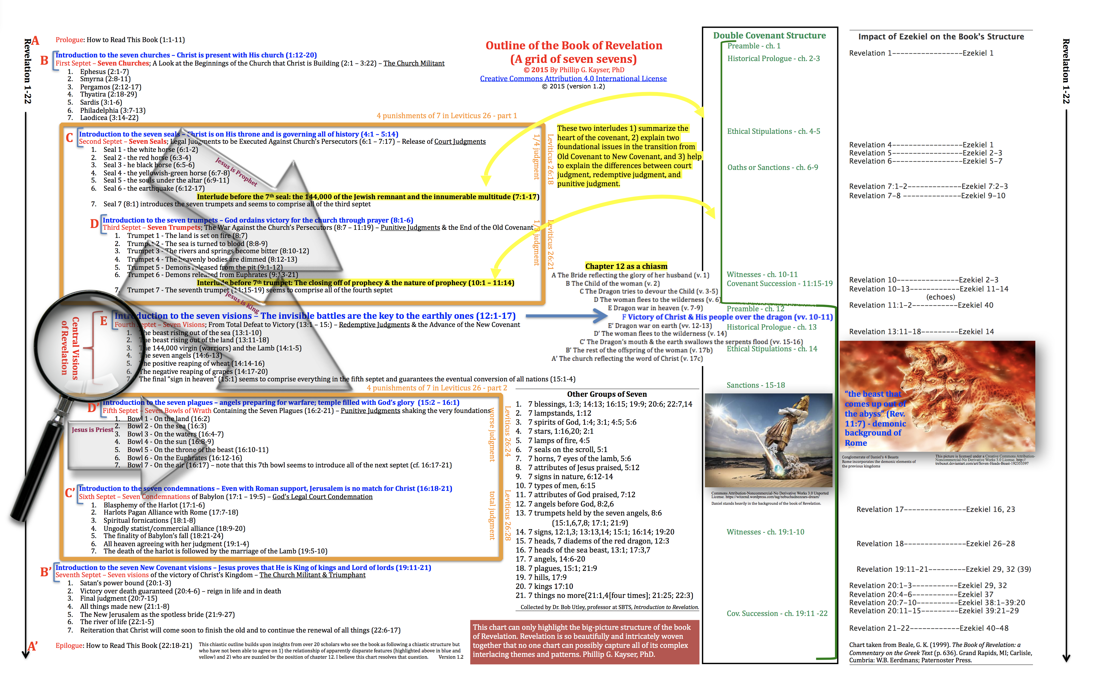 Let me explain what I am talking about: Everybody agrees that we are in the last section of the book of Revelation. But the divine structure shows that this last section does not start in chapter 20. If you look at the handout titled, "Outline of the Book of Revelation," (it's this one that has the picture of the toppling statue and the seven headed beast coming up out of the fire), you can see that there are seven units of seven in this book. The blue print text gives the introduction to each section. And at the bottom left of the page next to the big B you will see that the introduction to our section starts in chapter 19:11. And if it didn't, we wouldn't have an introduction and the book would lose its symmetry. Every one of the seven sections of the book has an introduction, and the introduction to this section goes from chapter 19:11 to chapter 19:21. Well, that automatically indicates that the events of the first three verses of chapter 20 have to start after the events of chapter 19. Most Postmils and Amils completely miss that. In other words, the 1000 years does not begin in AD 30 or way off in our future. It begins in AD 70 right after the events at the end of chapter 19. So all through this book I have sought to be faithful to the divinely inspired structure that I have put into your hands.